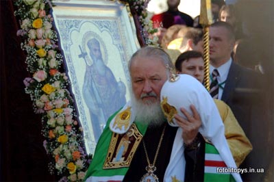 Разительным контрастом выглядит описание встречи Патриарха Кирилла на богослужении в день памяти святого равноапостольного великого князя Владимира в Киево-Печерской лавре. Московские священники даже признались, что при виде огромного моря людей, приехавших из разных областей Украины, «чтобы помолиться вместе со своим первоиерархом», пережили особый духовный опыт. «Видно, что это не купленная любовь, не акция, проведенная по команде, а самое искреннее выражение доброго чувства по отношению к Церкви и ее предстоятелю», -- отметил о. Всеволод.