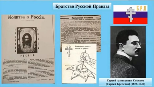 Лектор рассказала еще об одном эмигрантском объединении – «Братство Русской Правды» (1922– 1940). Оно не было собственно церковным, но считалось военно-политическом, ставя задачи организации военного антибольшевистского действия на территории Советской России, создание партизанских отрядов для терактов и распространения антикоммунистической идеологии и литературы на этой территории. Братство возглавил поэт-символист Сергей Соколов, один из идеологов Белого движения. Это объединение Ликвинцева включила в свой обзор именно как братство, которое развивалось под покровительством митрополита Антония (Храповицкого), имея написанную им общую молитву о России. Что важно, это была одна из немногих политических организаций русского зарубежья, которая «мечтала о христианском правительстве будущей России – идеал Святой Руси стал для них политической программой». «Попытка соединить военно-террористическую деятельность с братотворением и молитвой за Россию – характерное явление для русского зарубежья», – отметила исследовательница.