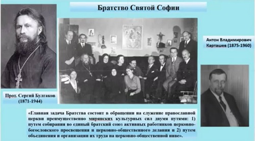 Очень значительное явление в жизни русского зарубежья – братство Святой Софии, созданное в 1924 в Париже под председательством прот. Сергия Булгакова (1877-1944). Особенность этого объединения – попытка «собрать в единый братский союз активных работников церковно-богословского просвещения и церковно-общественного делания». Это было своего рода «братство над братством», объединяющее профессоров и преподавателей Свято-Сергиевского института, наставников церковной молодежи. С этим братством связаны такие известные имена, как Антон Карташев, Николай Бердяев и многие другие. О. Сергий стремился к «смирению в братском общении – исканию истины не ради собственного эго, а ради общего соборного делания». «Искомое соборное мышление» связано с «творческим братотворением, с актом любви, с попыткой понять другого и жить с другим» – такие задачи были поставлены. Но, по словам Ликвинцевой, эта попытка «изначально была обречена на неудачу»: членам братства трудно было договориться – так, Бердяев фактически сразу выходит из него, чтобы не оставаться в одном братстве с Петром Струве, который мыслит кардинально противоположно. А митрополит Евлогий с сожалением писал о том, как трудно ввести «соборное начало» в церковную жизнь «нашей больной эмиграции».