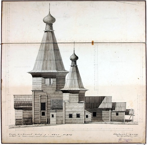 Обмерный чертеж Александра Ополовникова (вид с севера). Источник: фондовые коллекции музея-заповедника Кижи.