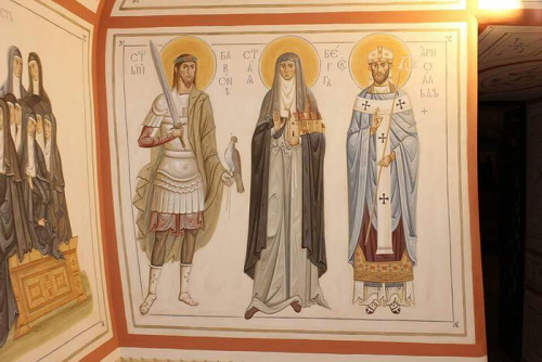 Фреска с изображением прп. Бавона (слева) и прп. Бегги (в центре)