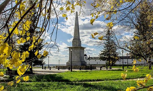 Покоритель Сибири атаман Ермак Тимофеевич до основания Тобольска не дожил, но не увековечить память о нем здесь, конечно, не могли. В 1839 году на холме под названием мыс Чукман был установлен 16-метровый мраморный обелиск с соответствующей посвятительной надписью. Памятник спроектировал архитектор Александр Брюллов, брат знаменитого живописца. Спустя полтора десятилетия вокруг монумента был разбит сад, построены оранжереи. Сейчас Сад Ермака выглядит несколько иначе, чем в XIX веке, но остается излюбленным у горожан променадом.