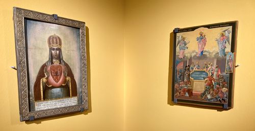 Образы Богоматери широко представлены на выставке. Помимо малоизвестных икон (таких, как «Богоматерь Псково-Печерская», «Богоматерь Озерянская» или «Богоматерь Пюхтицкая»), можно увидеть образы, восходящие к западным образцам. Так, «Богоматерь Римская» – это напоминание о почитаемом веками в Риме образе «Salus Populi Romani» («Спасение народа Римского»), только без консульского кольца, зато с короной. «В некоторых случаях своеобразная иконография, сложившаяся под влиянием западных образцов, воспринималась как идеологически нетрадиционная, что препятствовало ее тиражированию»,– сказала Яковлева и показала икону «Богоматерь Небо и храм Божества», обратив внимание на то, что на уровне груди Богоматери написано огромное огненное  сердце, внутри которого изображена Троица в изводе «Сопрестолие».
