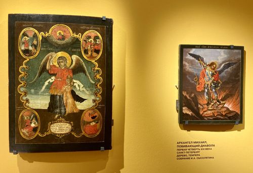 Особую группу представляют иконы, близко копирующие произведения западноевропейской живописи, известные в России благодаря гравюрам, литографиям и фототипиям. Образ архангела Михаила, попирающего диавола, написан в первой четверти XIX века в Санкт-Петербурге по работе известного итальянского живописца Гвидо Рени (1575–1642). В 1820 году в Красноярске провинциальным мастером Тимофеем Ростовцевым воспроизведена знаменитая картина Рафаэля «Преображение».