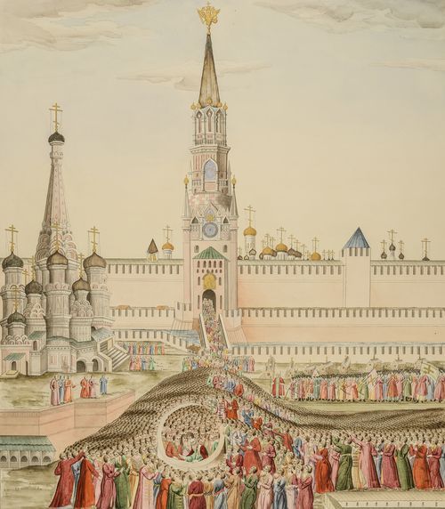 Собор Покрова на Рву, Спасская башня. Лист из альбома «Книга об избрании на царство великого государя, царя и великого князя Михаила Федоровича». Фото: МУАР