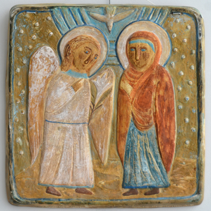 Каждый из них показал и прокомментировал свои работы. Ольга Скубченко – потомственный скульптор, она создает монументальные произведения, и все они связаны с христианской символикой: это фигуры св. Георгия Победоносца, скульптурные композиции из библейского цикла («Бегство в Египет», «Вход Господень в Иерусалим» и др.), библейские дерева из глины (олива, пальма, кипарис), многочисленные ангелы и задумчивые рыбы. По словам художницы, она тяготеет к архаике, упрощению форм, условности, неяркой фресковой росписи, чтобы скульптура воспринималась как бы «вне времени, как будто ее откопали археологи». Монументальные произведения созданы не для церковного пространства, они выставлялись во многих городах России рядом с иконами. А к иконе скульптор пришла не сразу: по ее словам, керамическая икона – «цельное, собирательное дело, требует от художника особой собранности, молитвенного состояния». Так появился цикл Двунадесятых праздников, Николай Чудотворец и другие иконы.