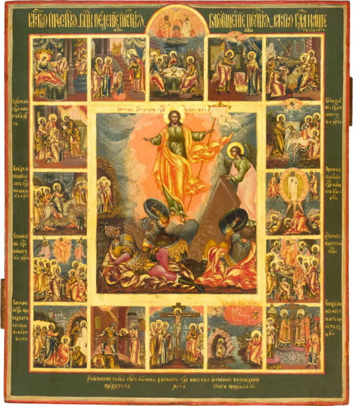 Большинство икон посвящены сюжету Воскресения Христова – Сошествию во ад. На разных иконах этот центральный сюжет окружают клейма разной тематики – евангельские события, православные праздники, страсти Христовых и другие сюжеты.