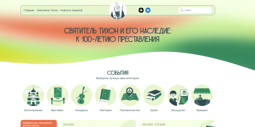 На новой интернет-площадке все события, посвященные святителю Тихону, сгруппированы по епархиям, а также по тематикам и форматам: богослужения, выставки, концерты, лектории, паломничества, уроки, экскурсии, ярмарки.