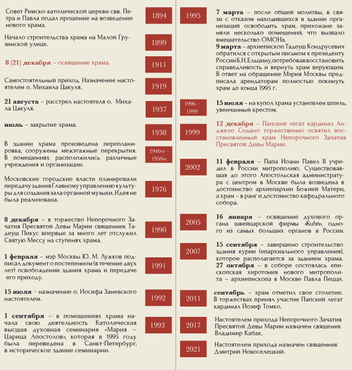 2002, 11 февраля – Папа Иоанн Павел II учредил в России митрополию. Существовавшая до этого Апостольская администратура с центром в Москве была возведена в достоинство Архиепархии Божией Матери, а храм – в ранг и достоинство кафедрального собора.