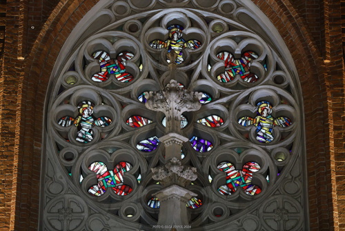 Оба боковых нефа отделены от главного нефа колоннадами, по 2 полуколонны и по 5 колонн в каждой колоннаде. Потолки главного и боковых нефов состоят из крестовых сводов, которые образованы диагональными арками. Боковые продольные нефы собора имеют по пять колонн-контрфорсов каждый. 10 основных контрфорсов, на которые опирается главный объём храма, по древним канонам храмового зодчества символизируют 10 заповедей. Стрельчатые оконные проёмы украшены витражами. Под оконными проёмами, на внутренних поверхностях стен, находятся 14 барельефов – 14 «стояний» Крестного пути.