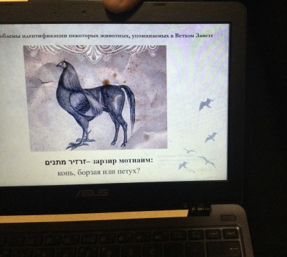 Священник Сергий Шилов для примера разобрал строфу из 30 главы Книги Притч. На русском языке: «Вот трое имеют стройную походку, и четверо стройно выступают: лев, силач между зверями, не посторонится ни перед кем; конь и козёл, и царь среди народа своего». На церковнославянском: «Трие суть, яже благопоспешно ходят, четвертое же, еже добре проходит: скимен львов крепчае зверей, иже не отвращается, ни устрашается скота, и петель ходя в кокошех благодушен, и козел предводитель стаду, и царь глаголяй к народу во языце». Даже в славянских текстах видна разница – конь и петух. «И в Септуагинте, как и на церковнославянском, в этом месте написано «петух, весело обходящий курочек», – с улыбкой заметил докладчик. «Это же слово на английском в переводе короля Якова (KJB) обозначается словом «greyhound», то есть здесь роль коня выполняет конкретная порода собаки – борзая. Петух также присутствует в латинском переводе Библии, в Вульгате: «gallus succinctus lumbos» – петух с подпоясанными бёдрами. В арабском переводе Библии в этом месте стоит «зурзур (или «зарзир») быстроходный» – певчая птица средних размеров, с прямым конусовидным клювом. В современном иврите ее отождествляют со скворцом. Кстати, похожую на длиннохвостого скворца птицу описал в своем исследовании английский священник, путешественник и орнитолог Генри Бейкер, он увидел его в иорданской долине», – пояснил священник. Отец Сергий показал иллюстрацию, которая отражает все эти переводы – некое сборное животное с копытами, крыльями и клювом, заметив, что это шутливое пояснение переводчиков.
