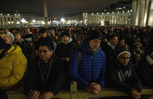 Молодежь, семьи, священники, монахини, кардиналы, проживающие в Риме, главы дикастерий и члены Римской курии собрались на площади Святого Петра в 21:00 по римскому времени. В молитве приняли участие около тридцати кардиналов: в первых рядах были замечены Тагле, Уэлле, Прево, Артиме, Баньяско, Ферочи, Семераро, Берк, Мюллер, Беччу. Другие, как кардинал Черни, находились среди народа. В молитве также участвовали сестра Рафаэлла Петрини, которая через неделю возглавит губернаторство Ватикана, и несколько сотрудников Курии и Римской епархии.