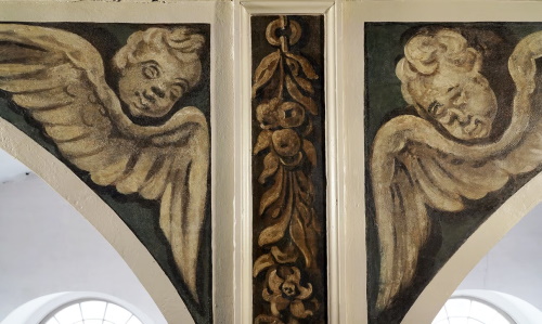 Фестоны, написанные на деревянных панелях, были сделаны по единому шаблону. Покобене считает, что они могли быть изготовлены за пределами церкви и установлены уже в готовом виде. А вот херувимы, ко всеобщему удивлению, оказались не трафаретами, а уникальными произведениями с разными выражениями лиц и характерами. Выполненные в приглушенных землистых тонах, призванных имитировать европейскую резьбу по камню, они неожиданным образом оказались написанными на ярком бирюзовом фоне. Специалисты приняли решение раскрыть и отреставрировать всех оставшихся херувимов в верхней части арок.