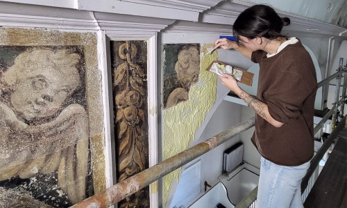 Неровности штукатурки на стенах и собственные объемные мазки Гиббса густыми масляными красками создали труднодоступные углубления, с которыми специалисты работали при помощи смоченных ватных тампонов. Реставраторы выявили ожидаемые повреждения у изображений ангелов с детскими личиками в пазухах сводов и гирлянд с фруктами на колоннах, и в то же время работа принесла ряд сюрпризов.