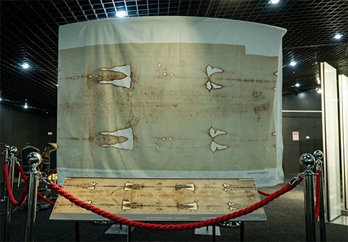 Справка. Плащаница представляет собой льняное полотно размером 4,36 на 1,1 м, на котором запечатлено изображение мужчины, подвергшегося жестоким пыткам и распятого на кресте. Следы бичевания, распятия, венца из терна и пронзенного копьем бока удивительно точно совпадают с описаниями страстей Христовых в Евангелиях, а ряд деталей дополняют эти рассказы. На ткани была обнаружена пыльца растений, которые растут только в том регионе Средиземноморья, где проходила земная жизнь Иисуса Христа.
