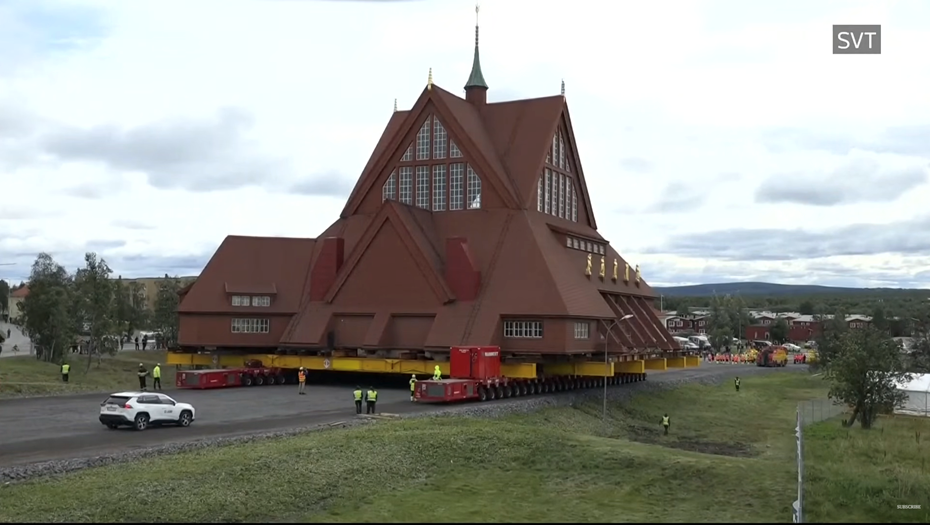 Постройку весом 672 тонны подняли с фундамента, поместили на специальную платформу-прицеп и начали перевозить на новое место. Перемещение церкви понадобилось из-за расширения крупнейшего в мире месторождения железной руды. Рудник угрожает проседанием почвы под историческим сооружением: церковь перемещают на 5 км на восток от шахты. Путь займет два дня: 672-тонный памятник нельзя везти быстрее 500 метров в час. Переезд обставят как церемонию – ее будут транслировать онлайн, в событии участвуют шведский король Карл XVI Густав и группа KAJ, представлявшая страну на Евровидении.