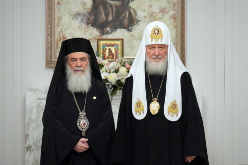 Вечером того же дня состоялась встреча Патриарха Кирилла и Патриарха Иерусалимского Феофила III. Предстоятели двух Церквей обменялись мнениями о недавних событиях на Святой Земле, состоянии межправославных отношений в мире и обсудили другие вопросы.