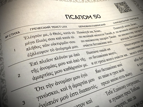 Еще одна особенность Псалтири на трех языках – QR-коды, размещенные на страницах каждого псалма. С их помощью можно перейти к аудиозаписи и услышать, как звучит древнегреческий текст в редакции Септуагинты.