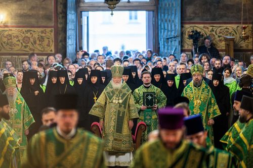 Предстоятель Русской Церкви обратился к верующим с первосвятительским словом. Далее Патриарх проследовал в Троицкий собор, где совершил славление перед мощами преподобного Сергия Радонежского.