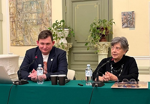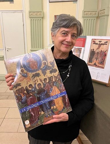 Открывая презентацию, Дж. Парравичини отметила, что издание альбомов-календарей по христианскому искусству продолжается уже более 40 лет. Этот проект был инициирован итальянским фондом Russia Cristiana («Христианская Россия»), альбомы выходят в издательстве «La Caza di Matriona» («Матренин двор»). В первые годы он печатался только в Италии и ставил своей задачей знакомство западных читателей с русской христианской культурой. Каждое такое издание сопровождается монографической статьей специалиста по теме – для альбома писали тексты ведущие советские/российские и западные искусствоведы. Главная тема всего издательского проекта – культурные взаимосвязи Востока и Запада, отражение единства христианского мира в изобразительном искусстве. Альбомы были посвящены сакральным изображениям Византии, Италии, Сербии и Македонии, Грузии, Армении, Турции (Каппадокии) и других стран. В последние годы издатели возвращаются к представлению и осмыслению на новом этапе шедевров древнерусской живописи: недавно вышел альбом, посвященный иконам Ростова Великого. Альбом-календарь на 2026 г. было решено посвятить новгородским иконам из собрания Новгородского музея-заповедника (НМЗ), из Софийского собора (ранее выпускались альбомы по новгородской иконе из собраний Русского музея и Третьяковской галереи). «В Италии люди просто с ума сходят от русских икон», – сказала Дж. Парравичини и продемонстрировала итальянское издание календаря.