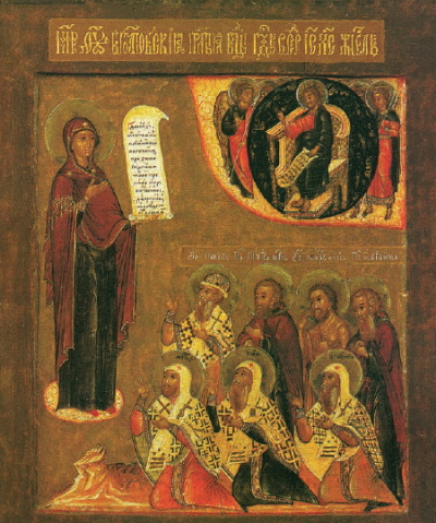 «Богоматерь Моление о народе, с ростовскими святыми» (на первом плане — ростовские епископы Леонтий, Исайя и Игнатий; на втором — епископ Иаков, Пётр Ордынский царевич, Исидор Блаженный, преподобный Авраамий)