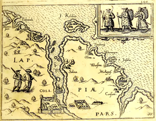 Миниатюрная карта Лапландии, изображающая северо-западное побережье Кольского п-ва. Внизу карты виден Кольский острог. Показаны населенные пункты по берегам, остров Кильдин. На мысе Святой Нос обозначен поморский крест. В правом верхнем углу изображены три лопаря. Литография из книги «Warhafftige Relation. Der dreyen newen vnerhorten, seltzamen Schiffart, so die hollandischen vnd seelandischen Schiff gegen Mitternacht, drey Jar nach einander, als Anno 1594. 1595. vnd 1596. verricht. : Wie sie Nottvvegen, Lappiam, Biarmiam, vnd Russiam, oder Moscoviam» 1598 /Veer,Gerrit de/ Иллюстрация: kolamap.ru