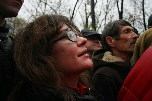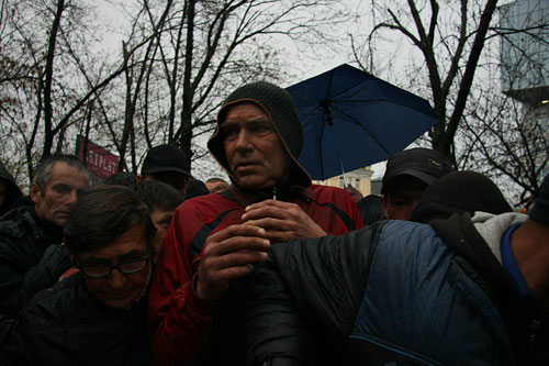 На вид большинство этих людей вполне приличны и опрятны. Но если приглядеться, то видно — не все в порядке. Например у женщины в коричневом пальто, она стоит в центре, в такую погоду на ногах...сандалии! Она живет на вокзале. Подробнее рассказвать о себе она отказалась.
