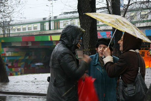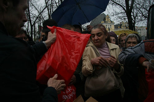 Около Курского вокзала поздравили с наступающей Пасхой 200 человек. Подарки – тушенка и сладости к чаю – были предварительно расфасованы добровольцами службы Милосердия по ярко-красным праздничным пакетам. В дождливую погоду, которая окутала в этот день Москву, эти пакеты в руках людей выглядели яркими пасхальными фонариками.