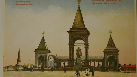 Бронзовый крест с распятием на гранитном постаменте (проект Виктора Васнецова) поставлен в 1908 году на месте убийства главнокомандующего войсками Московского военного округа великого князя Сергея Александровича эсером Иваном Каляевым в 1905-м близ Никольских ворот Кремля. Снесен 1 мая 1918-го на коммунистическом субботнике под руководством Ленина, который принимал в деле активное личное участие. Памятник-крест воссоздан в 1998-м, но установлен в московском Новоспасском монастыре.