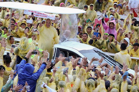 Понтифик призвал присутствующую на встрече молодежь, включая семинаристов и монашествующих, всегда помнить о том, что настоящее счастье рождается от помощи другим людям. Те, кто живет согласно этому критерию, по мнению Папы, имеют шанс стать силой необходимой для обновления общества, не только через восстановление зданий, но прежде всего, через построение Царства Божия, Царства святости, справедливости и мира в своем земном отечестве. «Критерий, по которому мы относимся к бедным, — подчеркнул Святой Отец, — станет критерием, согласно которому мы будем судимы». По дороге в аэропорт Папа Франциск кратко посетил бедную семью рыбаков, а также местное кладбище, где благословил общие могилы неидентифицированных жертв тайфуна. В Манилу Святой Отец вылетел на четыре часа раньше, чем это было запланировано, чтобы не попасть под удар сильного ветра, которым сопровождается шторм.