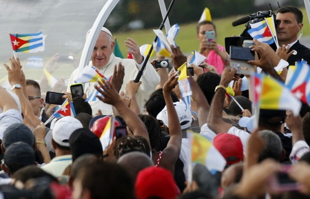 Появление понтифика - аргентинца Марио Хорхе Берголио - на центральной площади кубинской столицы было встречено ликованием толпы и приветственными возгласами присутствующих. На пути следования папамобиля мимо рядов верующих папа Франциск неоднократно останавливал транспортное средство, чтобы спуститься к пастве, лично поприветствовать ее, пожать руки, благословить. Он также остановился, когда поравнялся с группой тяжело больных прихожан, и поприветствовал каждого из них.