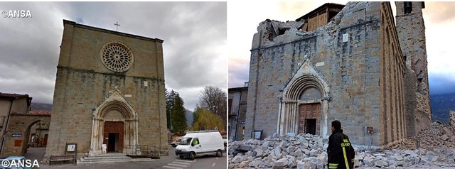Церковь св. Франциска в Аматриче до и после землетрясения. Фото: ANSA