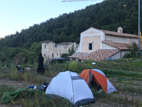 Два монаха останутся в Норча. Они будут ночевать в палатках вне городских стен. Монахи остаются в разрушенном городе, чтобы следить за базиликой и монастырем.