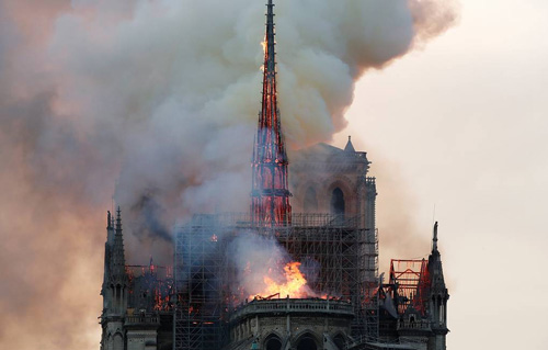 Сильный пожар произошел в соборе Парижской Богоматери в прошлый понедельник. Пожар начался на строительных лесах, возведенных над крышей собора в связи с реставрацией. Храму нанесён значительный ущерб: обрушились его шпиль и крыша.