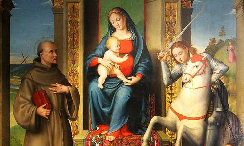 При этом картина Корреджо куда более сложная: художник нашел новые способы представления атрибутов святых со ссылками на обстоятельства их жизни, композиция оживлена легкой асимметрией и волнистыми формами изображаемого движения. Работа же Лонги выглядит не только более напыщенной, но и слегка абсурдной — с Георгием, убивающим дракона в архитектурном интерьере, и бесстрастным коленопреклоненным донатором на переднем плане. Но современников автора, особенно провинциалов, эта картина, вероятно, впечатляла ничуть не меньше, чем произведение Корреджо.