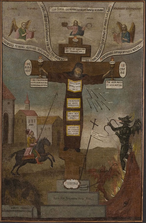 – И немало. Например, картина «Иночество, достойное изображения», на которой изображен распятый на кресте монах, который претерпевает скорби, нападения бесовских сил, грехи по плоти, но побеждает все это своими монашескими добродетелями. То есть это изображение – аллегория монашеского подвига.