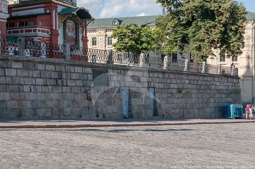 Уточнятся, что подпорная стена – значительно более позднее сооружение, чем сам собор. В 1817 году при благоустройстве Красной площади по проекту архитектора Бове собор был обнесен с двух сторон подпорной стеной и кованой решеткой.
