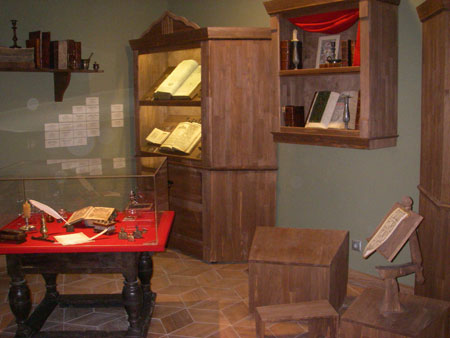 Третья часть выставки дает возможность заглянуть в средневековый скрипторий. Однако авторы экспозиции не пошли по пути реконструкции, они попытались воплотить то, что изображалось на древних миниатюрах. Именно поэтому все элементы интерьера (седалище, пюпитр, книжные полки) сделаны так, чтобы напомнить об обратной перспективе, а условную арку-вход перекрывает алый велум – символическая драпировка, которая изображалась на иконах. В скриптории выставлены старопечатные книги, утварь и письменные принадлежности, созданные на протяжении VIII–XX веков византийскими и русскими мастерами.