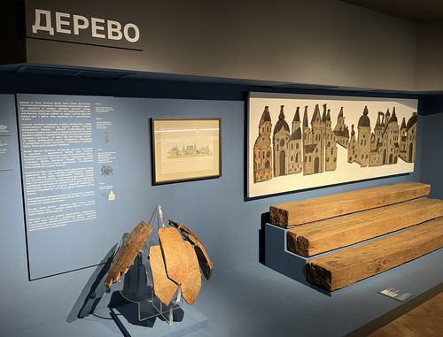 В разделе «Дерево» Христенко обратила внимание на водопроводную трубу XVII века из дворца царя Алексея Михайловича в Коломенском, созданную за сто лет до прокладки первого централизованного водопровода в Москве; на ступени из уничтоженного большевиками Чудова монастыря в Кремле; а также на «Град Иерусалим» – фрагмент резного «Распятия с предстоящими», венчающего иконостас неизвестной церкви XVII века и сохранившийся в часовне Николо-Угрешского монастыря.