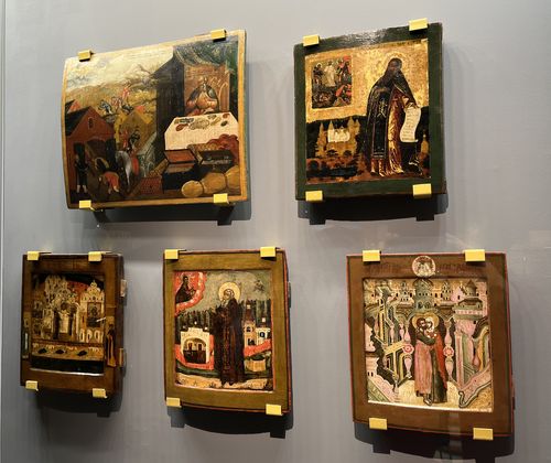 Экспозицию дополняет ряд икон XVII века на разные сюжеты, они подобраны таким образом, что на каждой из них можно рассматривать архитектурный фон, бытовую среду, изображение храмов и целых монастырей.