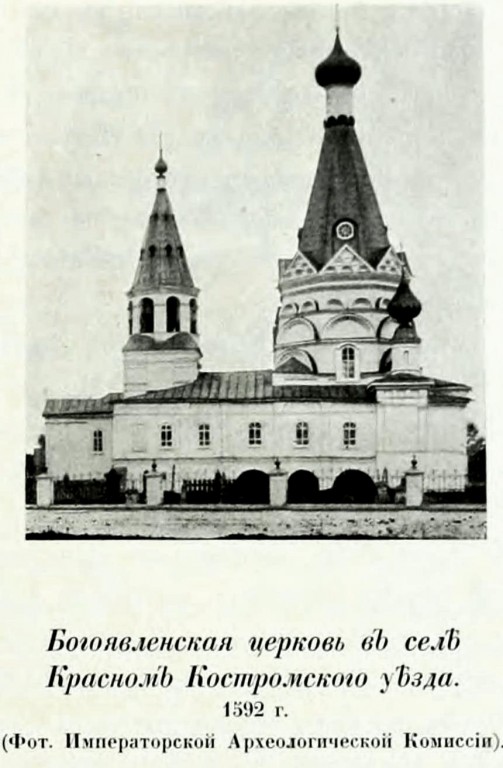 История храма неразрывно связана с возвышением боярского рода Годуновых. Село Красное, известное по документам с 1569 года, было их вотчиной. В 1592 году, в правление царя Федора Иоанновича, по заказу дяди Бориса Годунова – Дмитрия Ивановича – и по благословению первого Патриарха Московского Иова в центре торговой площади и была возведена каменная церковь Богоявления.