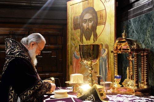 В Великий четверг Патриарх Кирилл совершил литургию в храме Христа Спасителя и омыл ноги 12 священникам